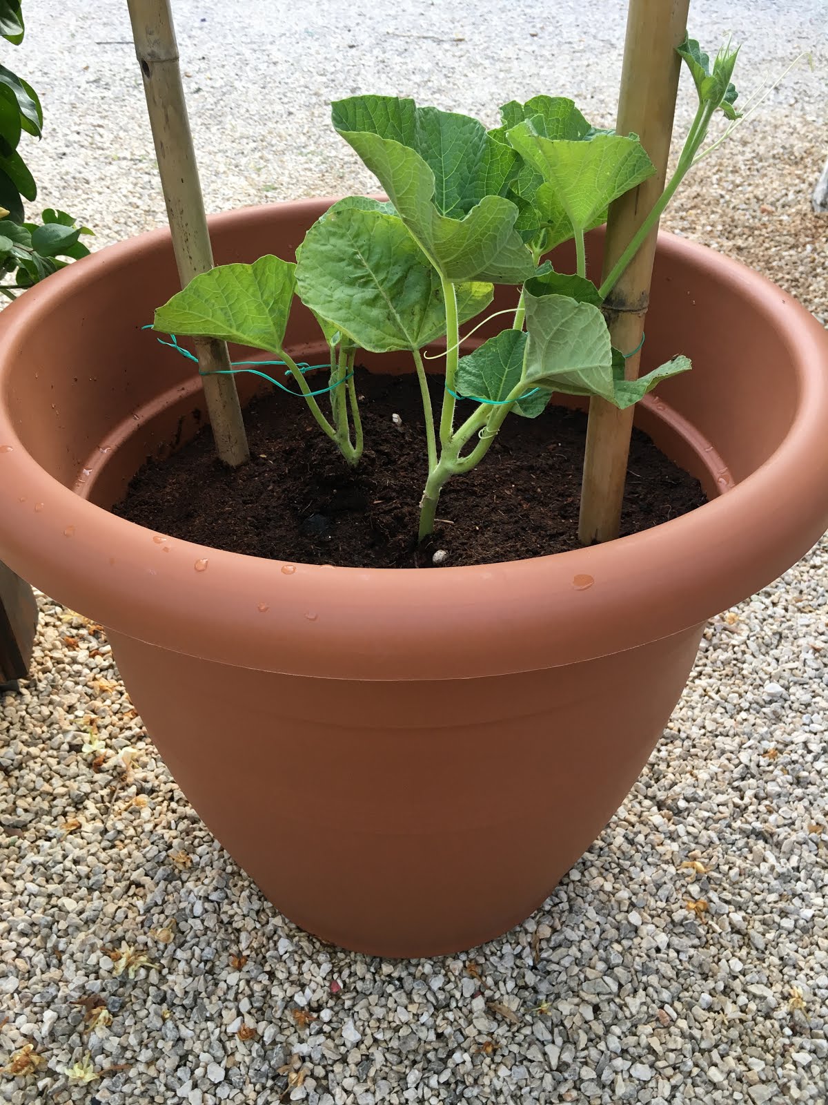 I decided to plant some more seeds in early June, and they have survived and look much better in bigger pots, (not in the ground) ready to grow up the pergola. No evidence yet of any bottle gourds but I suppose I have to be patient. Here's hoping!